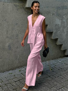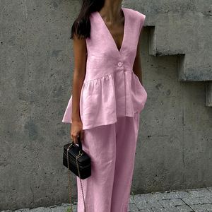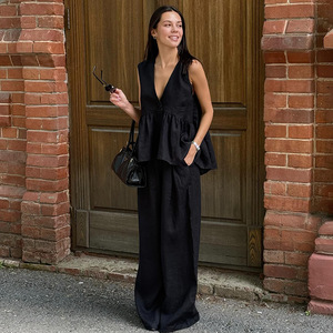 夏の新作Vネックノースリーブフリルルーズツーピースセットデザイン、ファッショナブルでカジュアルな2025クロスボーダー