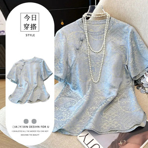 新しい中国風改良された国民風トップス女性の夏の新しい斜め前立てボタンジャカード半袖シャツ薄いインナーシャツ