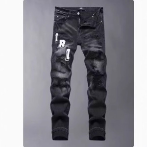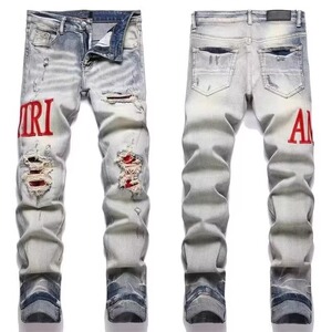 AMヨーロッパとアメリカのトレンディなブランド春と秋の乞食の穴レターパッチワークレザー刺繍スリムジーンズメンズトレンディな小足ロングパンツ