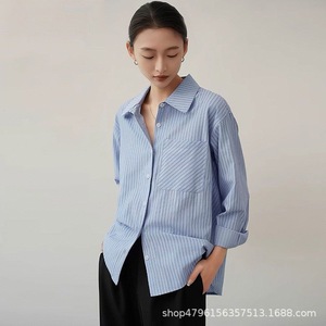 2025 フレンチ新スタイルブルーストライプシャツ春レトロルーズ気質アウターカジュアルシャツ通勤長袖夏