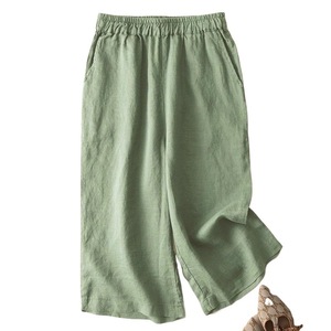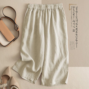 7色無地ルーズレトロカジュアルショートパンツ綿麻七分丈ワイドレッグレディースパンツネイビーブルー