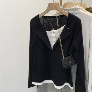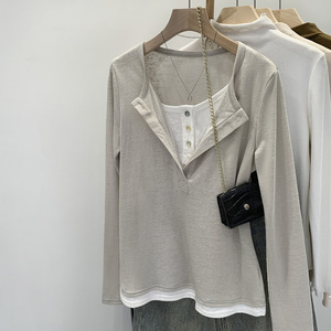 韩系chic别致假两件半开领长袖T恤女2025新款高级小众不撞款上衣