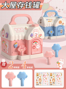 [ピンクのハイエンドバージョン] 大きな家の貯金箱 + ステッカー 2 枚 + 鍵 1 本