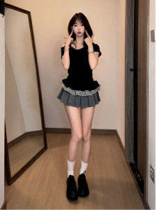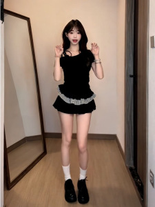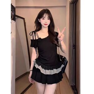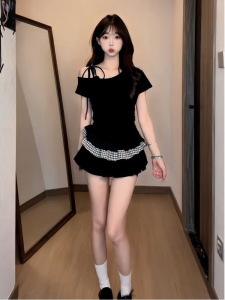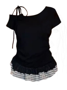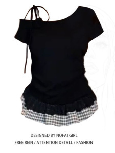 フレンチスプライスレースチェック柄ホットガールオフショルダーTシャツレディース夏スリムウエストワンショルダーフェイクツーピース半袖トップ