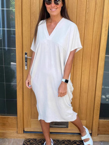 2025 春夏アマゾンクロスボーダーヨーロッパとアメリカの貿易 V ネックアイスシルク半袖レディース無地カジュアルミドル丈ドレス