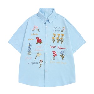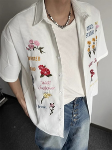 アメリカンレトロワッフル花柄シャツカラフルな刺繍半袖Tシャツルーズレイジースタイルカジュアル万能メンズTシャツ