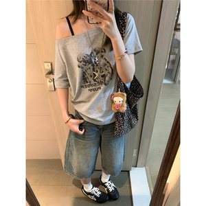21支纯棉复古斜肩短袖T恤女新款休闲宽松显瘦一字肩狗狗印花上衣