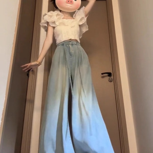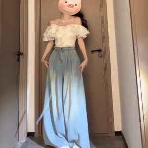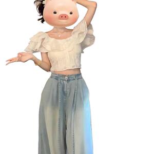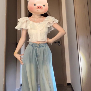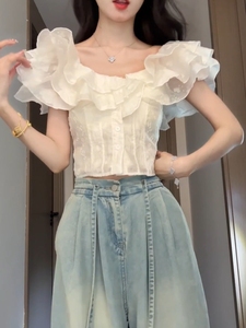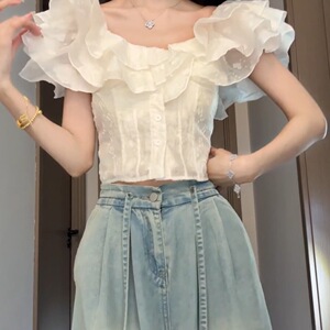 フレンチホワイトフリルレースシャツレディース夏新作フィッシュボーンウエスト痩身オフショルダー半袖シフォントップ