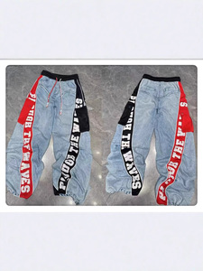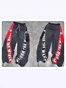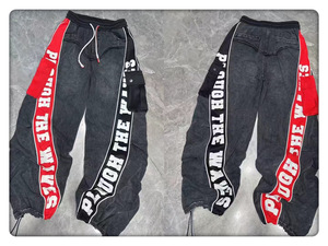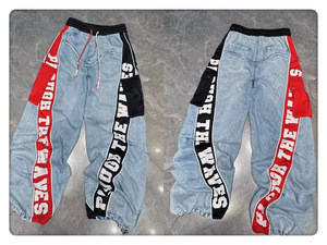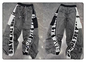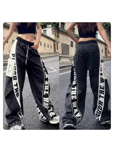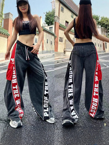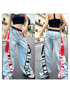ヨーロッパジーンズ レディース 2025 秋新作 ヘビーデューティー レッドとブラックのレタープリント ウェビング 大きなポケット 巾着パンツ トレンド