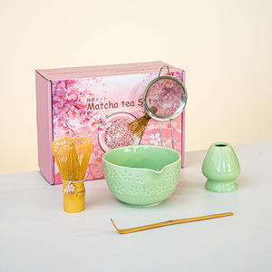 日本製抹茶茶器セット 桜ボウル 注ぎ口付き 8点セット フルセット カラーボックス ピンク付き