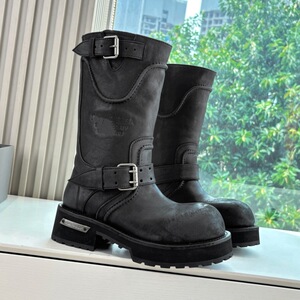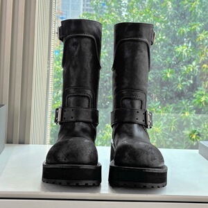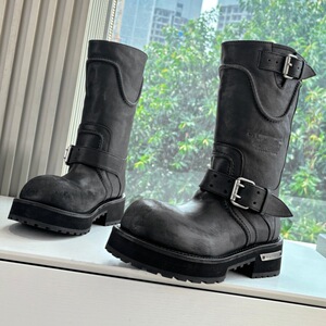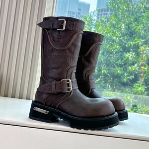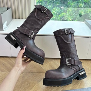 2025年パリレトロ風ウォッシュ加工ヴィンテージブーツ、レディースミドル丈ライダーブーツ、メンズベルトバックル厚底ミドル丈ラウンドトゥブーツ