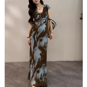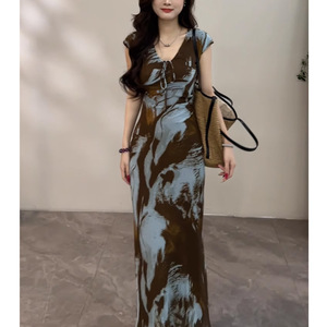 気質半袖ミドル丈夏新作エレガントスタイル抽象Vネックストラップスリムフィットドレス女性用
