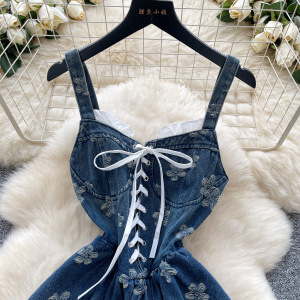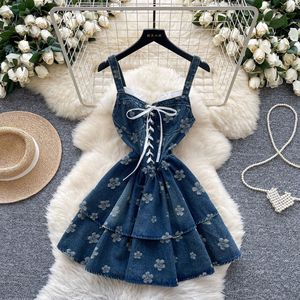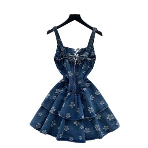 ドーパミンホットガールスタイルプリントデニムサスペンダードレス女性の夏の耳ストラップウエストスカート小人用