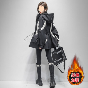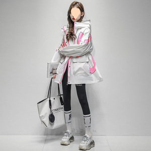 ファッショナブルなコントラストカラーのジャケット女性のための 2025 春と秋の新しいウエスト痩身ミッドレングスカジュアルフード付きウインドブレーカー