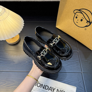 女の子の革靴 2025 秋の新子供の光沢のあるレザーローファー黒学生靴ファッショナブルなスリッポンシューズトレンディ