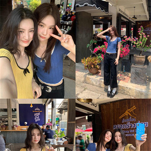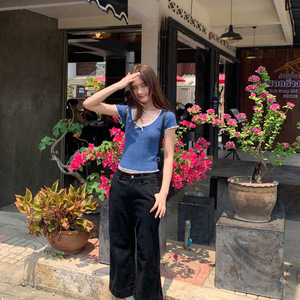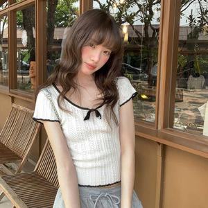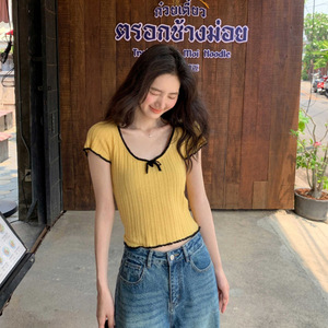 オリジナルアメリカンコントラストカラーニット半袖シャツ女性のための夏の2025新しいデザインスリムフィットショートトップ