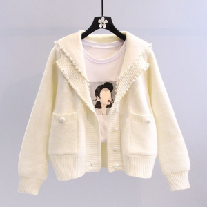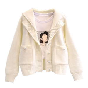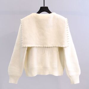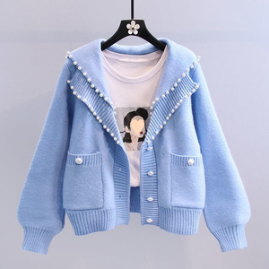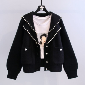 複合パールセータージャケット女性の年齢軽減西洋スタイルネイビーカラー重ビーズニットカーディガン 2025 秋