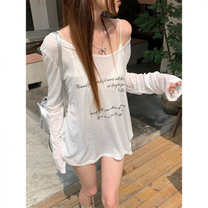 レイジースタイルレタープリントオフショルダー長袖Tシャツレディース春夏ゆったりカジュアル着痩せ万能薄手日焼け止めトップス