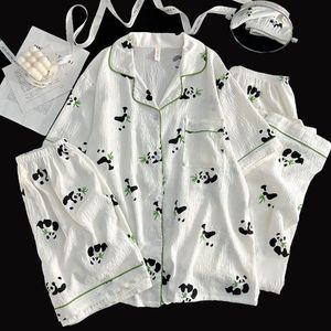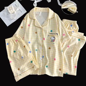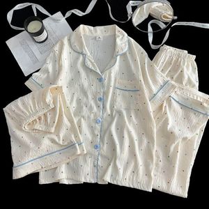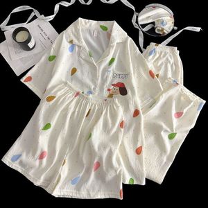 クロスボーダー卸売クラウドコットンスリーピースパジャマ女性用半袖ズボンショーツさまざまなカーディガンラペル漫画ホーム服