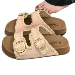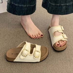 牛革バージョン~厚底ビルケンシュトックサンダル、女性用夏アウター2025新スタイル、スカート付き、シーサイドビーチスリッパ