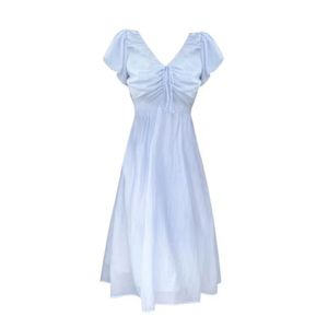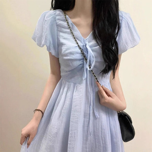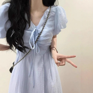 フランス文学レースアップVネックブルーパフスリーブドレス小柄な超妖精ウエスト痩身ロングスカート
