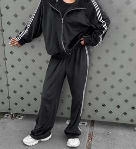 ヨーロッパとアメリカのクロスボーダースポーツとレジャーの新しいフード付きジャケット、ルーズなコントラストカラーのストライプのズボン、女性用のワイドレッグパンツの2点セット