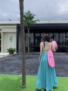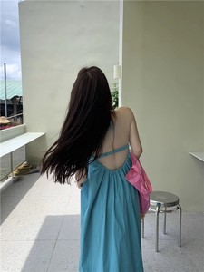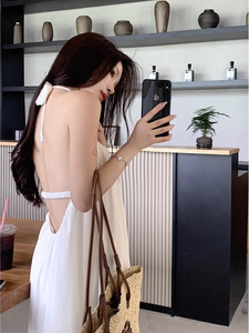 ホワイトリゾートスタイルバックレスサスペンダースカート女性の夏フレンチスタイルホルターネックドレスシーサイドビーチスカートロングスカート