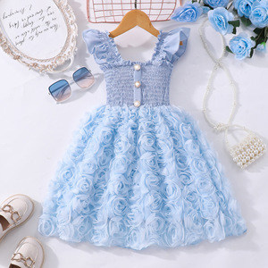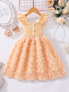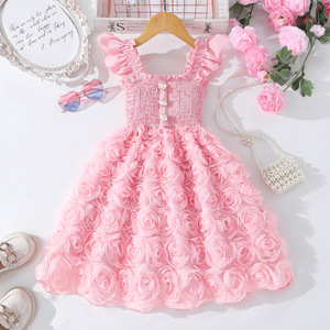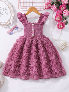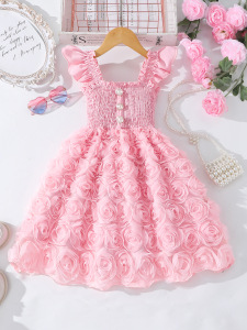 女の子(小)ドレス、夏用無地フライングスリーブ立体ローズ抱きドレス