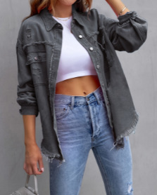 2025 新しいクロスボーダーヨーロッパとアメリカのデニムジャケット女性の無地ルーズジャケットリッピング長袖女性のデニムシャツ
