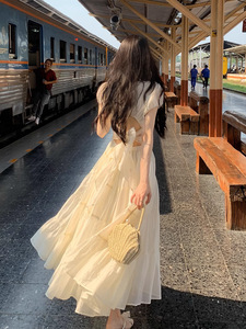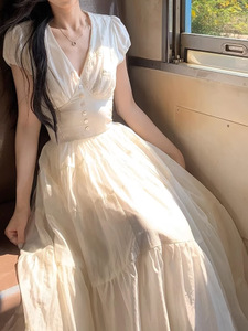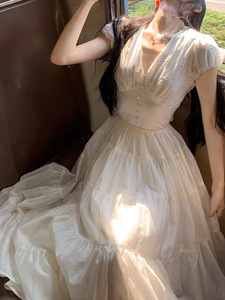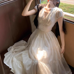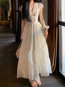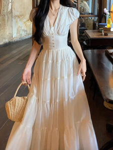 「リリスのウェディング」夏Vネック半袖ウエスト痩身ドレスフェミニン