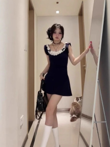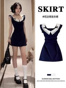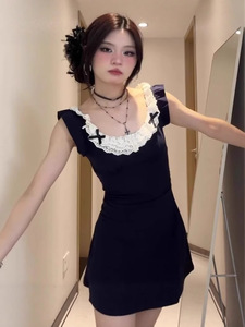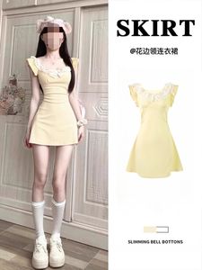 夏の美しいドーパミンレースの小さなフライングスリーブウエストドレス女性の夏の小さなピンチウエストAラインヒップカバーショートスカート