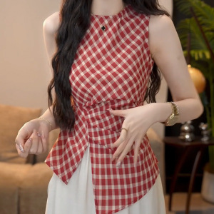 フレンチレトロな赤いチェック柄のノースリーブベスト、女性用夏のウエストデザインニッチプリーツシックなラウンドネックトップ