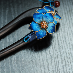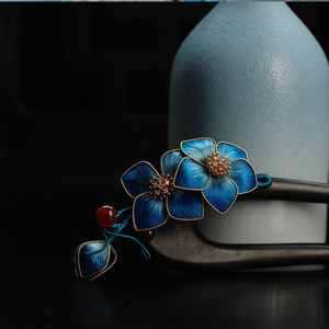[Baohua] 手作り無形文化遺産シルクベルベットフラワーヘアアクセサリーバーントブルーヘアピンレトロチャイナドレス古代スタイル漢服頭飾り
