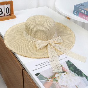 大きなつばのレースの麦わら帽子 - ベージュ