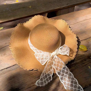 大きなつばのレースの麦わら帽子 - カーキ