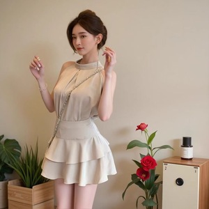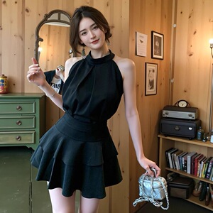 感小香风套装裙女夏小个子连衣裙小黑裙无袖挂脖吊带裙两件套