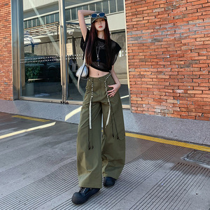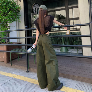 アーミーグリーンアメリカンシミターオーバーオール女性のための 2025 夏薄いクールスタイル大きなポケットルーズカジュアルワイドレッグパンツ