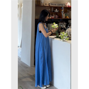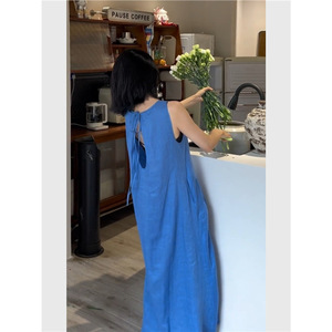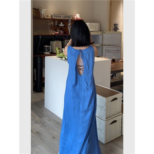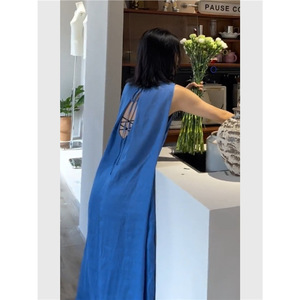 深セン Nanyou Gaozhifeng クラインブルーノースリーブドレス夏の女性の 2025 新しいフレンチビーチリゾートロングドレス