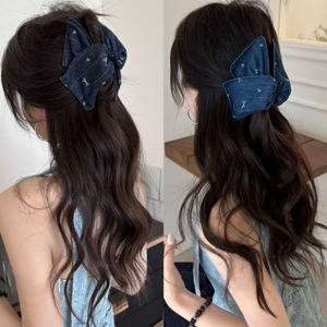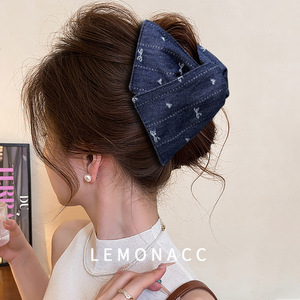 デニムトライアングル~後頭部にフルボウ柄のデニム、夏の雰囲気のシャーククリップ