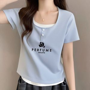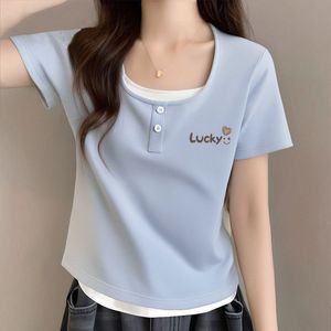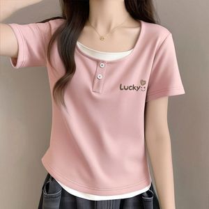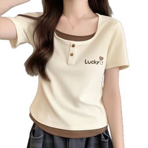 プラスサイズファットMM半袖Tシャツレディース2025夏新ニッチデザインホットガール右肩スリムフィットフェイクツーピーストップ