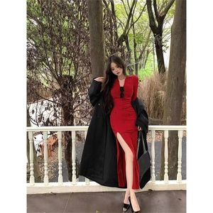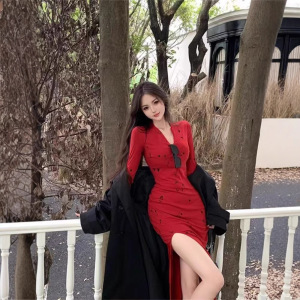 Olansh 純粋な欲望スタイルのスリットプリント気質レッドドレス秋のロイヤルシスターのウエストスリム長袖スカート