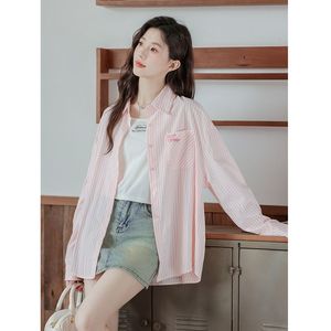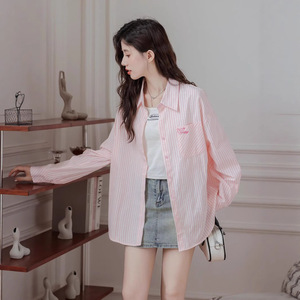 ストライプ柄ダンスガール風 若見え万能 ピンクの襟付き 薄手 夏用長袖日焼け止めシャツ 女性向け 輸入卸売