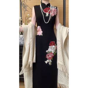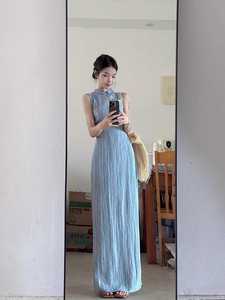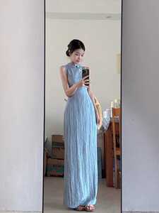 フランスのレトロなスタイルの改良されたチャイナドレス女性のデザイン新しい中国風のノースリーブストライプロングスカート夏