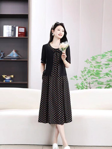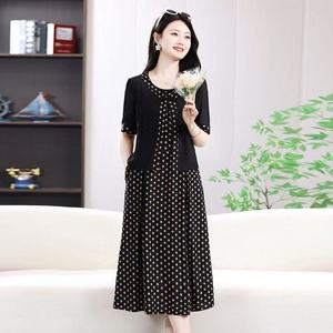 中国風の新しいスタイルのドレス、ファッショナブルな水玉模様のマザーズスカート、偽のツーピース痩身夏のお腹カバーショールスーツ