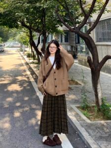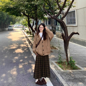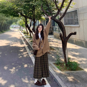 秋の小柄なティースタイルのコーヒーセーター、レイジースタイルのジャケット、チェック柄のスカート、デザインのツーピーススーツ
