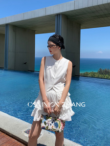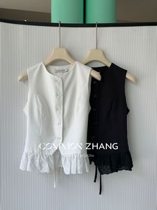 CZ ZHANG夏季法式简约花边镂空拼接纯色百搭圆领开衫马甲女B24835