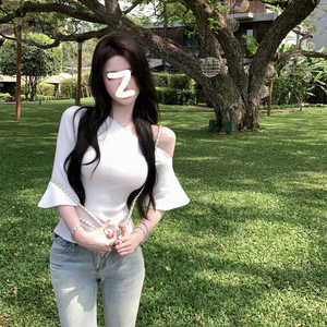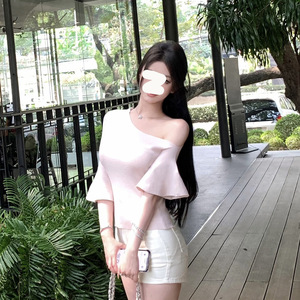 YIDENG2025春夏新作優しいスタイル万能斜め肩ニット蓮の葉袖ウエストTシャツ