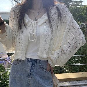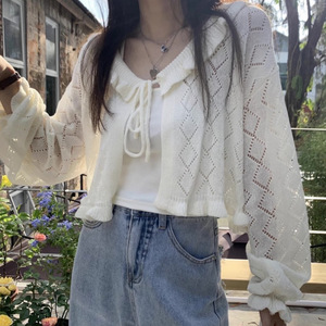 2025 夏レトロガールレースアップセータートップ多用途クリーム日焼け止めブラウス薄手のジャケット女性の服