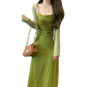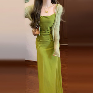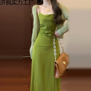 フレンチレトログリーンサスペンダードレスレディース2025年夏新作今年人気カーディガン気質着用春