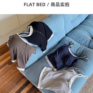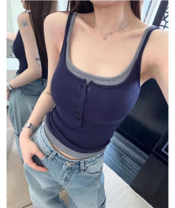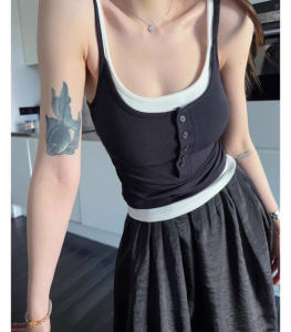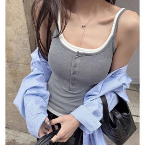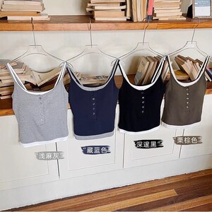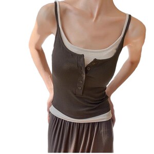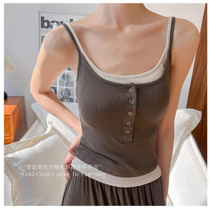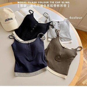 ゼロカーボンモーダルコントラストカラーボタン付きカップキャミソールレディーススリムフィットダブルショルダーフェイクツーピースボトムインナー